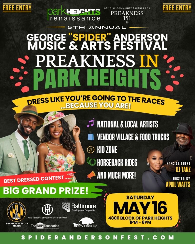 The 5th Annual George “Spider” Anderson Music & Arts Festival is a free, family-friendly celebration that honors the legacy of George “Spider” Anderson, the first Black jockey to win the Preakness in 1889, while welcoming national and local artists, vendors, food, horseback rides, family activities, and more, all while keeping culture, commerce, and community at the center. This festival serves as a powerful community activation and economic driver for Park Heights. This year’s “Preakness in Park Heights” theme invites guests to dress like they’re going to the races — because they are! Best dressed attendees will win their share of prizes.